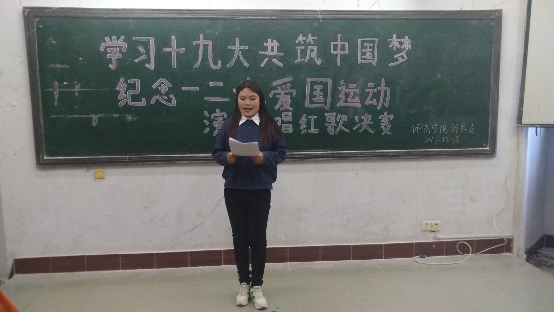 本次大赛的主题为学习十九大、共筑中国梦。音表一班郭德威、郭小亮的爱国合唱拉开了决赛帷幕。节目形式主要是演讲、唱红歌的。语教六班曹冉的演讲《成功与胜利永远属于自强者》激发我们中华儿女的爱国情怀;学前八班白尕拉措等四人带来了藏族风味的歌伴舞《北京的金山上》,她们以高昂的歌喉、优雅的舞姿展现出藏族人民对一二·九爱国运动的纪念。热情高涨的选手们以精彩的表现、充沛的情感赢得了全场热烈掌声。最后由主持人宣读获奖名单,并颁发了证书合影留念,此次比赛圆满结束。