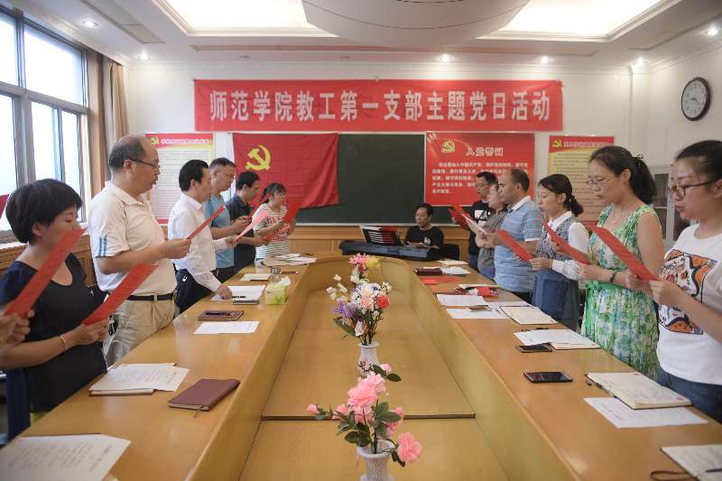 活动由四部分组成:一是支部全体党员在支部宣传委员王鑫同志带领下重温入党誓词;二是全体党员齐声诵读毛泽东诗词《水调歌头·重上井冈山》;三是支部全体党员逐一交纳7月份党费;四是在音乐教研室张满升老师的伴奏下,全体党员慷慨激昂,向党的生日献歌,唱响《我宣誓》与《歌唱祖国》。活动现场庄严肃穆,群情激昂。