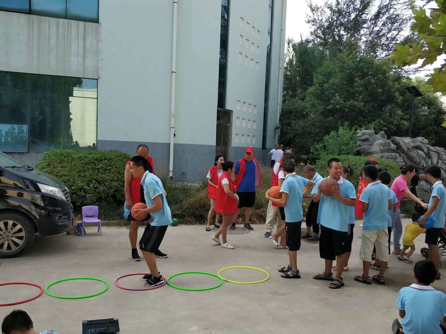在福利院工作人员引导下,团队成员排成四纵队,整齐有序地进入福利院。在一楼大厅,工作人员向大家介绍了福利院儿童情况后,就服务事项作了要求和说明,之后,按照分工,教工第一党支部成员到红宝石班,教工第党二支部成员到珍珠班,教工第三党支部成员到蓝宝石班,分头开始慰问及服务活动。第一支部的党员同志在工作人员协助下将孩子们安置在轮椅上,乘电梯下到一楼外空地上,离开房间看到蓝天与花草的孩子们格外兴奋,有了强烈的与人互动的意愿和举动。第二支部的党员同志接过工作人员的奶瓶细心地为孩子们喂起了奶,接着,在工作人员的协助下,将常坐轮椅的孩子们抱了起来,走出了房间,穿过走廊,下了楼梯,来到了楼下空地上。第三支部带领这些大孩子们来到了楼下操场上开始了篮球趣味活动。