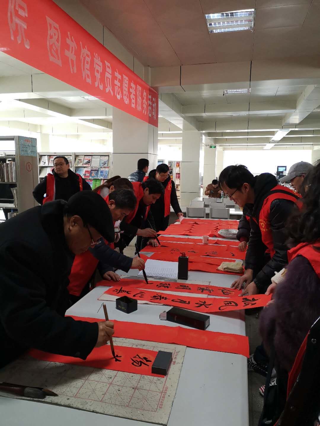 2019年1月28日,正值农历小年腊月二十三,三门峡市图书馆一楼大厅人声鼎沸,热闹不已,桌子上地板上铺满了墨迹未干的春联,整个大厅沉浸在新年到来之际的喜庆气氛中。早上8:30至12:00公司党总支与图书馆联合举行了“迎春接福”新春送春联党员志愿服务活动。yl2341144名党员参加了此次活动。