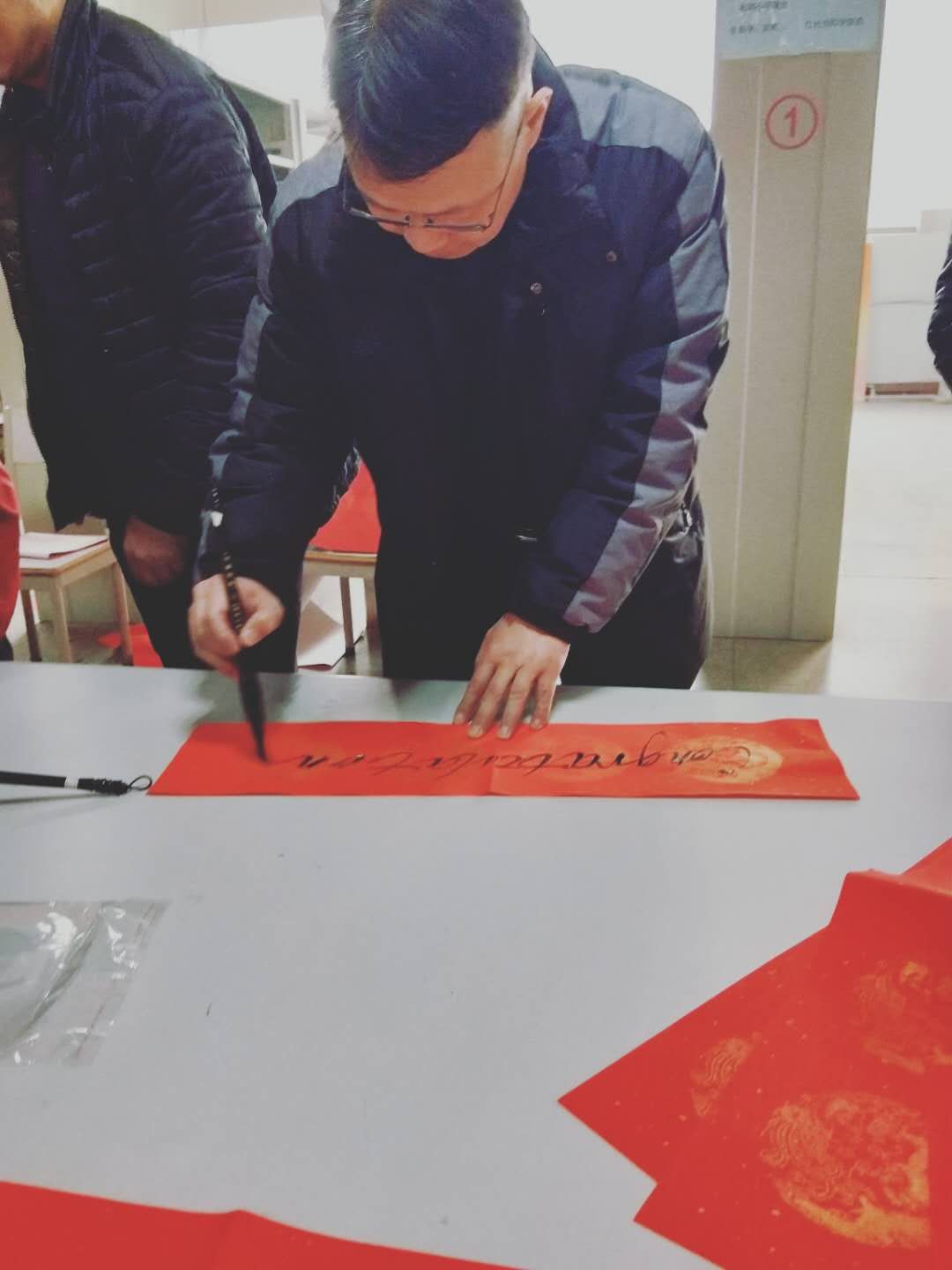 早上八点多不少市民早早来到活动现场排队等候,只见几位书法老师挥毫泼墨,一幅幅书写精美、寓意美好的对联呈现在市民面前。公司领导苑玉洁、樊卫兵也现场铺纸挥毫,为活动增添了靓丽的色彩。