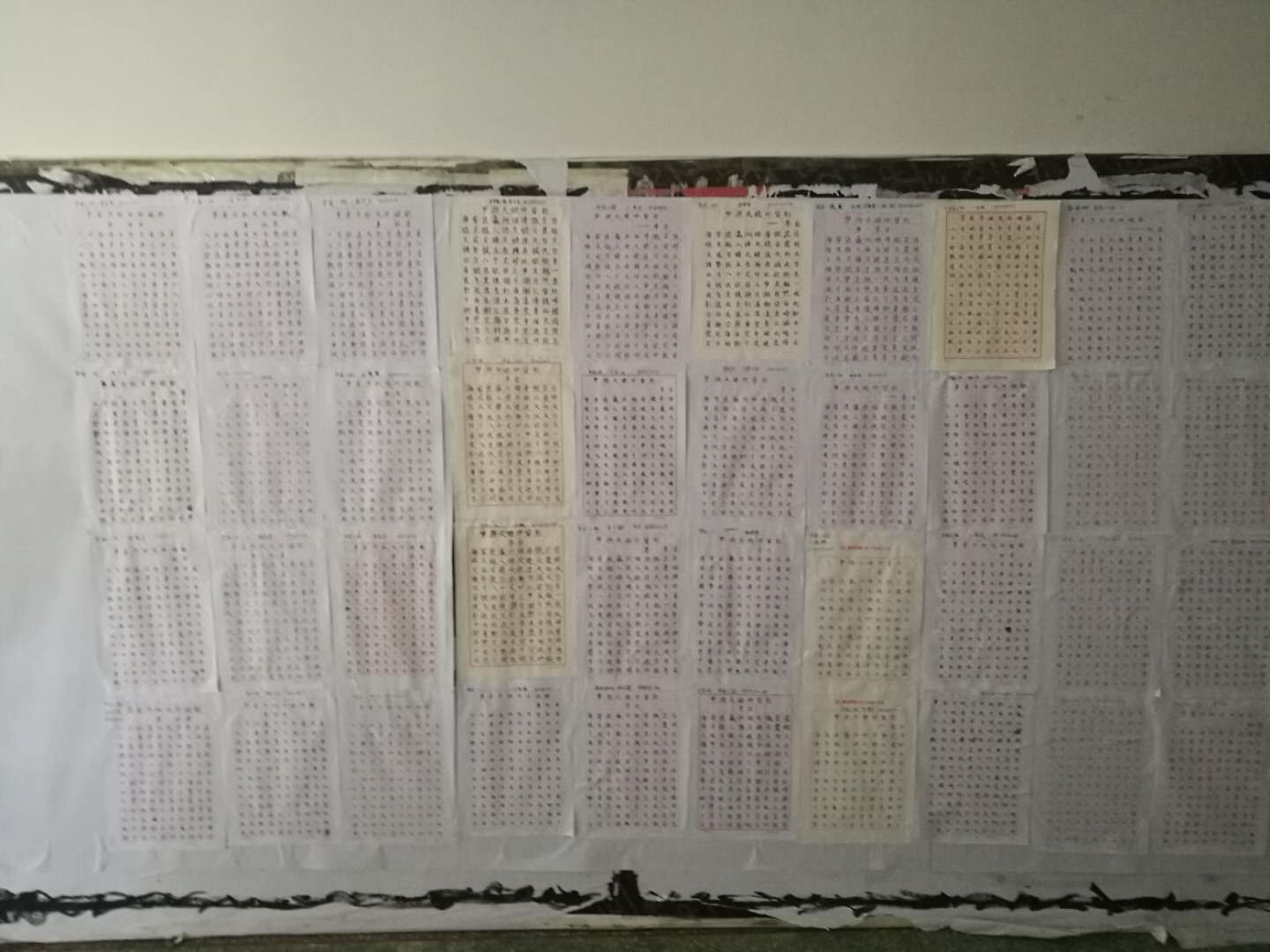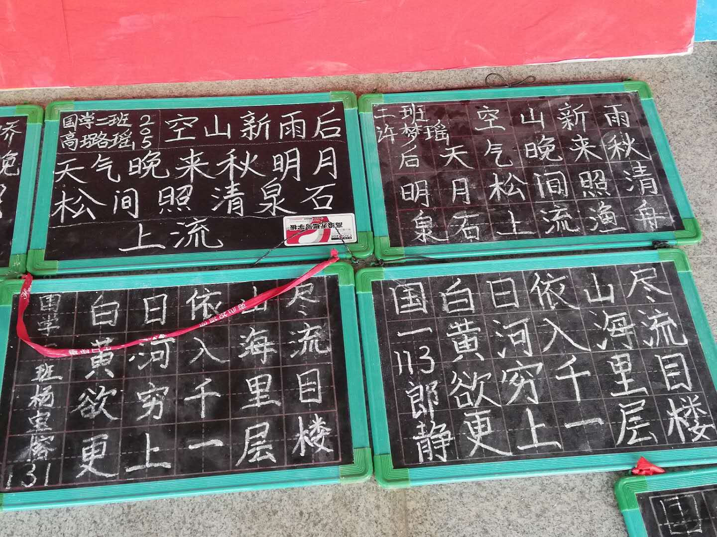 经过一段紧张的准备,作品终于展出,和大家见面了。共展出粉笔字100余幅(小黑板)其中国学班三十余幅;钢笔字三个版面共139幅,其中国学班一一个版面四十幅。作品展在五号教学楼一楼大厅及门外廊下平台。我的粉笔字、钢笔字作品均得以参展,我感到小欣喜不已。