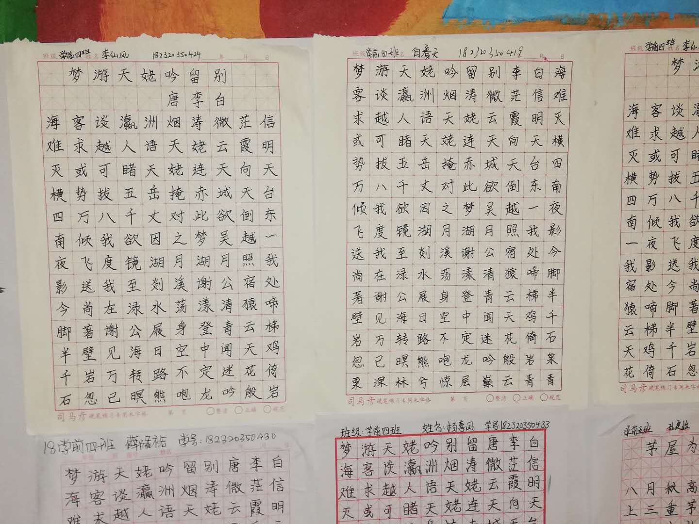 这次钢笔字、粉笔字展示活动,我们从中学到很多,也悟出很多。人无完人,人上有人,自我感觉非常好时,却发现还有更优秀的,进步更快的,这就需要见贤思齐,取人之长,争取更大进步,所以我给自己定的就是,一不自大、不自卑,二不懈怠、不放弃,三要坚持和不断超越。写字并不能一朝速成,要知道,水滴石穿,非一日之功。