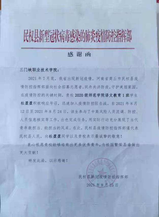 近日,yl23411收到了一份来自商丘市民权县新冠疫情防控指挥部的感谢信,对yl234112020级语文教育1班的杜盈盈同学今年暑期积极投身志愿服务,参加当地疫情防控工作的出色表现给予肯定和赞许。