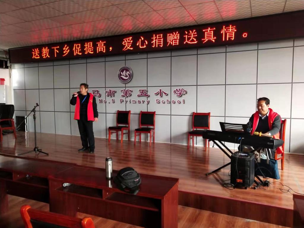 志愿者音乐教师张满升、张国祯、张茜等为小员工上音乐教育课。