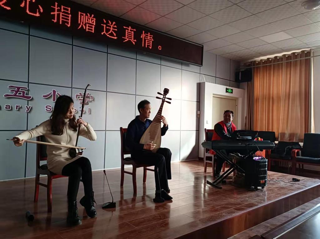 志志愿者张国祯、张茜、张满升老师为小员工表演民乐合奏《赛马》等曲目。