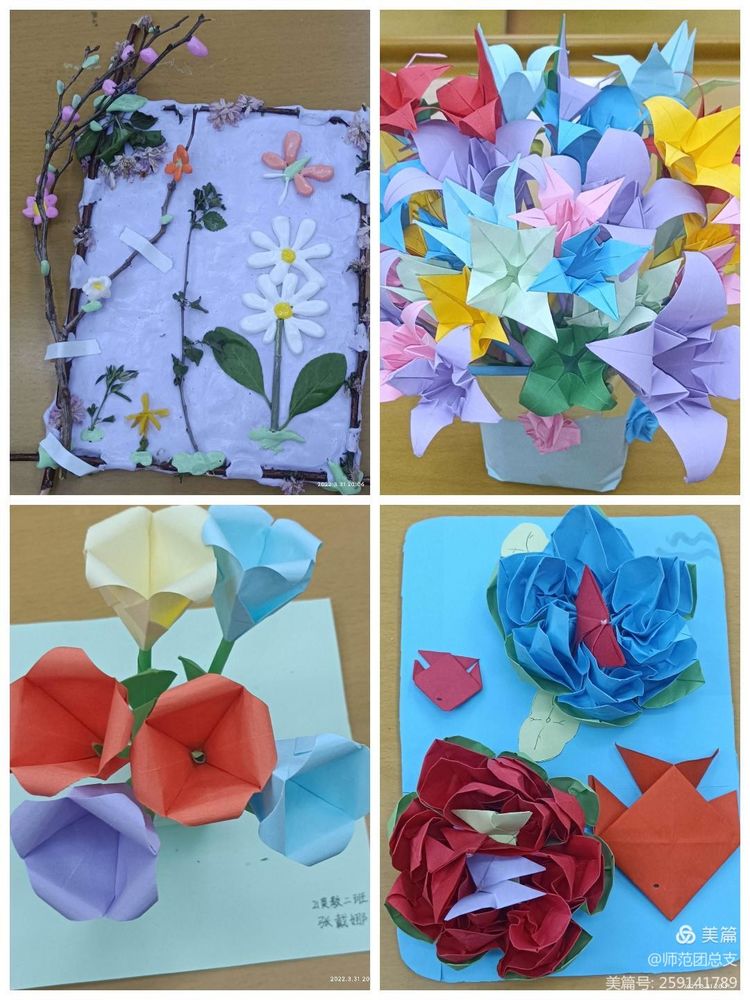 其次,同学们精心构思,大胆创作。做出了一幅幅、一件件各具特色的黏土画、折纸、衍纸画等精美手工作品。同学们心灵手巧,做出的作品栩栩如生,使人拍手称赞。