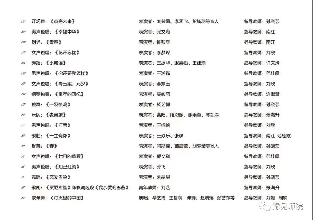 1.开场舞蹈《点亮未来》拉开演出序幕,奏响奋进的鼓点,表演者们着装色彩鲜艳,表演活泼热情,富有朝气,展示出年轻人独特的魅力。表演者:刘荣霞、李孟飞、贺斯羽等16人。指导教师:孙晓莎