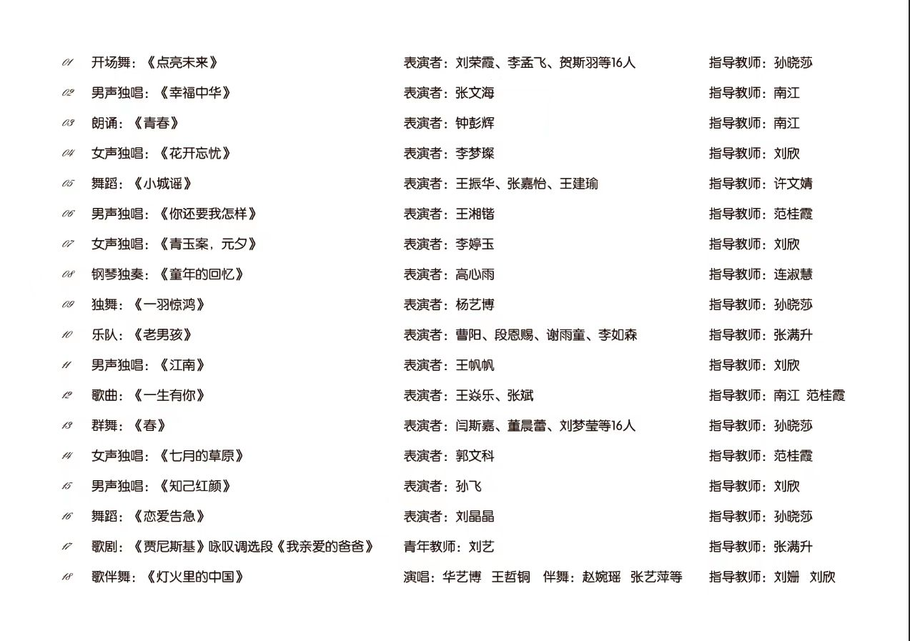 18.歌伴舞《灯火里的中国》,扣人心弦,唤起人们对往昔辛苦耕耘的回忆和对未来的斗志。奋斗心中历历在目的,激荡着永不停歇向前的梦想。演唱:华艺博、王哲铜。伴舞:赵婉瑶、张艺萍等。指导教师:刘姗、刘欣