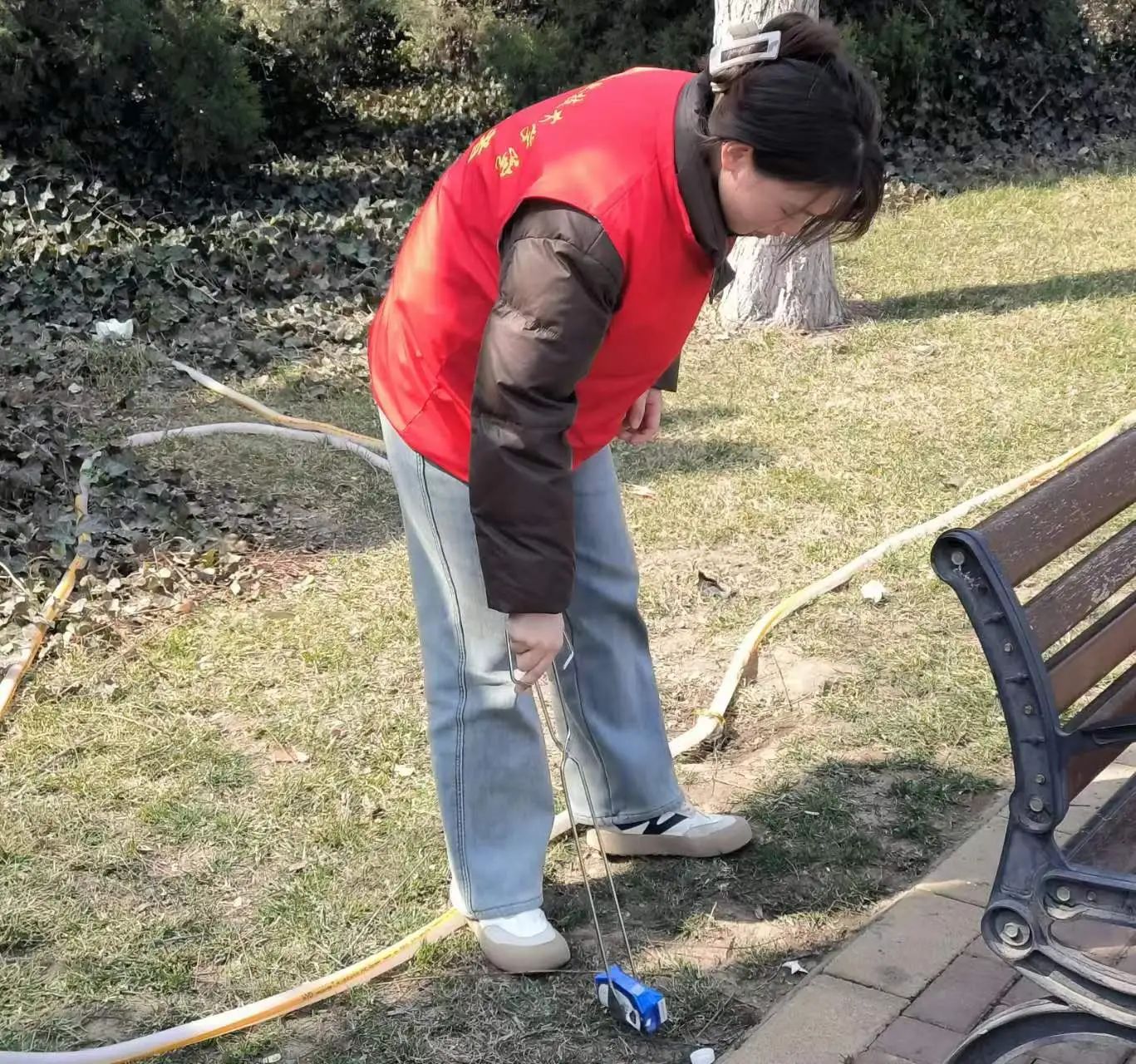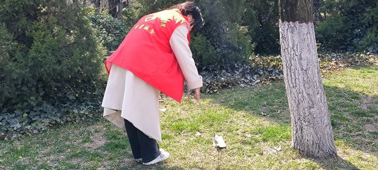 另一组志愿者拿着捡拾工具,捡拾纸屑、塑料袋等垃圾,同时对隐藏在草丛中的垃圾进行了细致的清理。