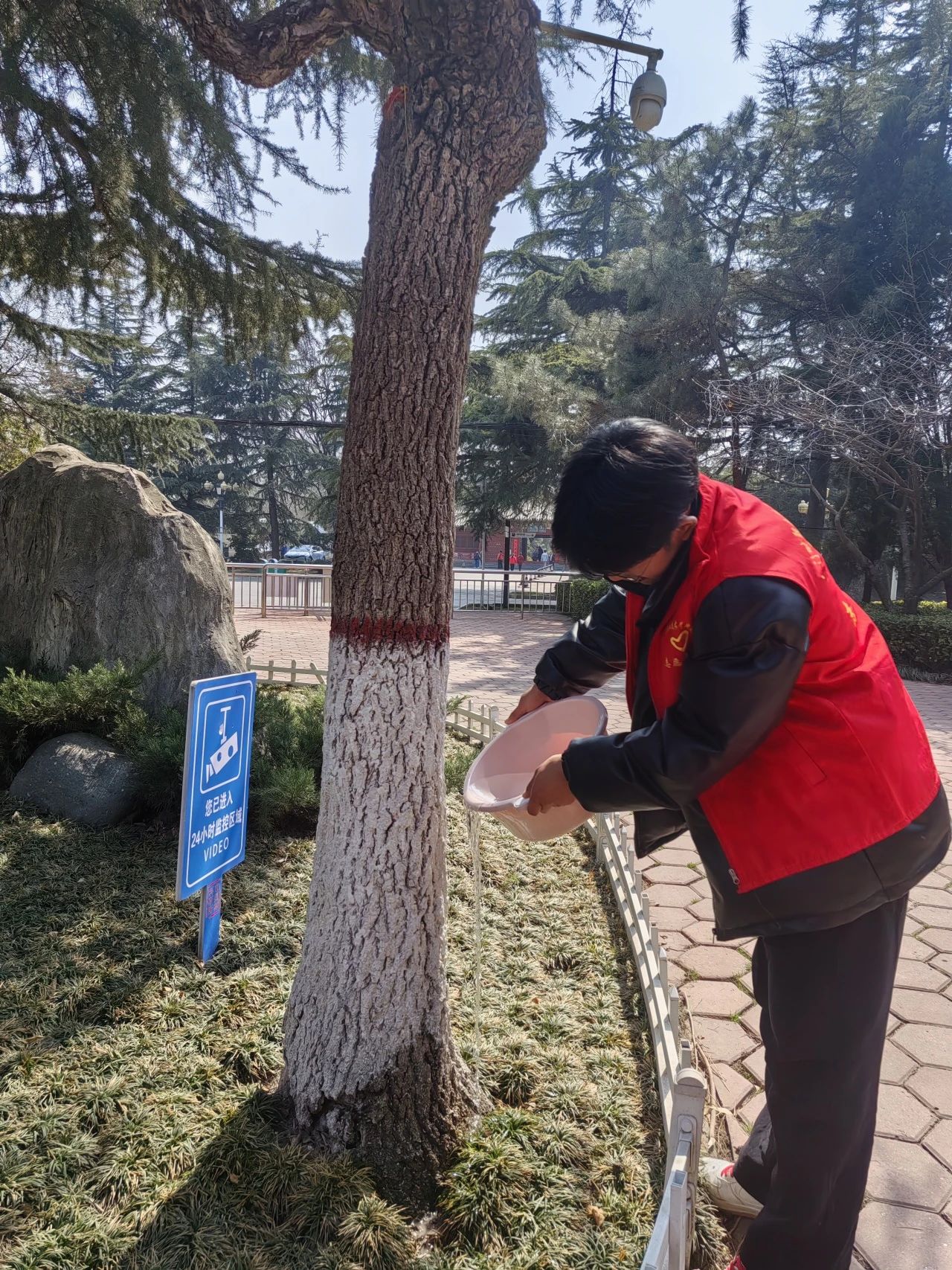 接着,志愿者们分小组进行浇灌和清理垃圾活动。一组志愿者对树木进行浇灌,有效的浇灌给植物提供了生长所需要的水分。