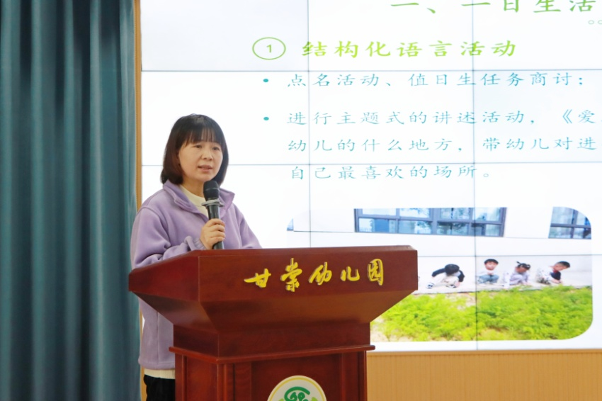 接下来,张亚楠老师代表中班从 “巧妙构思,打造多元语言天地;区域联动,开启互动交流;童声嘹亮,点亮语言梦想舞台”三个角度对本学期中班的语言活动进行总结。张丽娟老师代表小班从“一日生活中,语言渗透教育;集体活动里,语言互动成效;家园共育时,语言活动推进”三个方面对本学期小班的语言活动进行总结。