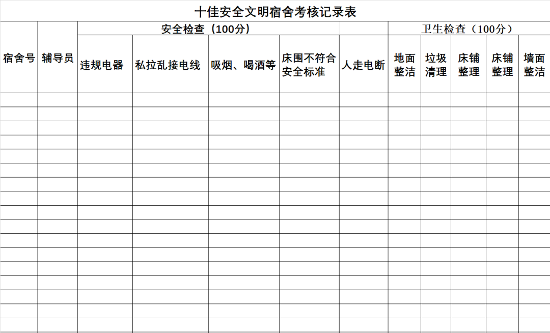 此次安全文明宿舍评比采用“安全检查(100分)+卫生检查(100分)”双百考核机制,围绕宿舍安全卫生“违规电器”“人走电断”“物品摆放”“墙面整洁”等要求,每月评选“十佳安全文明宿舍”,优秀宿舍将在学院公众号进行通报表扬,并给予奖励。此外,鼓励宿舍自主设计文化墙,展现“安全、向上、环保、高雅”的创意主题,优秀案例可附加10分,助力打造独具特色的宿舍名片。