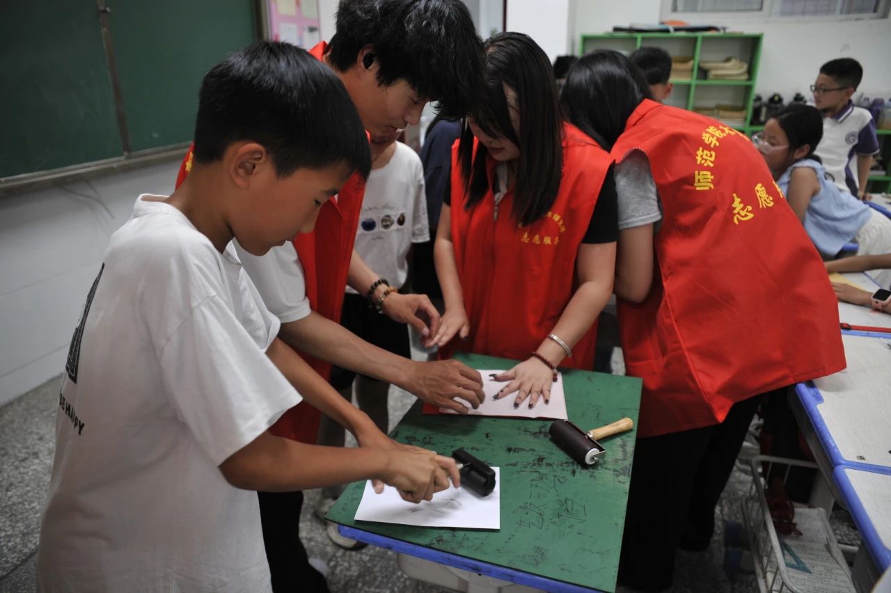 在实践教学环节,谢爽如、张聪慧、孙志平三位同学分组指导,手把手教孩子们完成版画制作。她们从刻板的力度把控、油墨的均匀涂抹,到拓印的技巧运用,都进行了细致入微的演示和讲解。