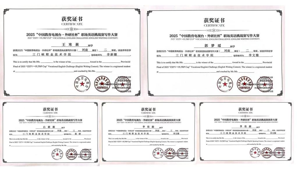 近日,“中国教育电视台・外研社杯” 职场英语挑战赛河南省赛在南阳圆满落幕。作为河南省高职院校职场英语领域的重要赛事,本次比赛吸引了全省 44 所院校的126名精英选手同台竞技,围绕职场英语综合应用能力展开激烈角逐,最终yl23411郭梦瑶、王寒莉两位同学斩获二等奖,李佳澈、尹凯乐、白璐璐三位同学荣获三等奖,以五项佳绩充分展现了公司学子的专业风采与学校的优质育人成效。