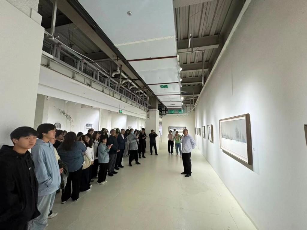 展览现场,同学们沉浸于艺术家笔下的雪境世界。王圣松教授以其独特的艺术语言,将故乡的冬日景致升华为对生命与自然的深刻感悟。其作品不仅展现了高超的绘画技艺,更传递出宁静致远的精神内涵。同学们驻足于画作前,细心观察油彩的肌理、品味笔触的力道、感受色彩的韵律,与艺术作品进行了一场深度对话。