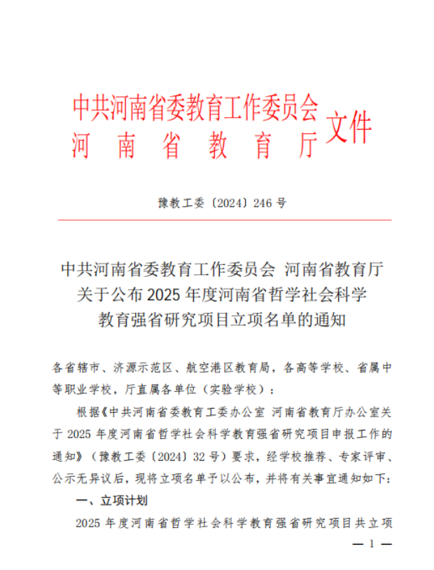 近日,河南省教育厅哲学社会科学教育强省研究项目评审揭晓,yl234115个项目获批立项,其中yl23411基本项目立项1项。