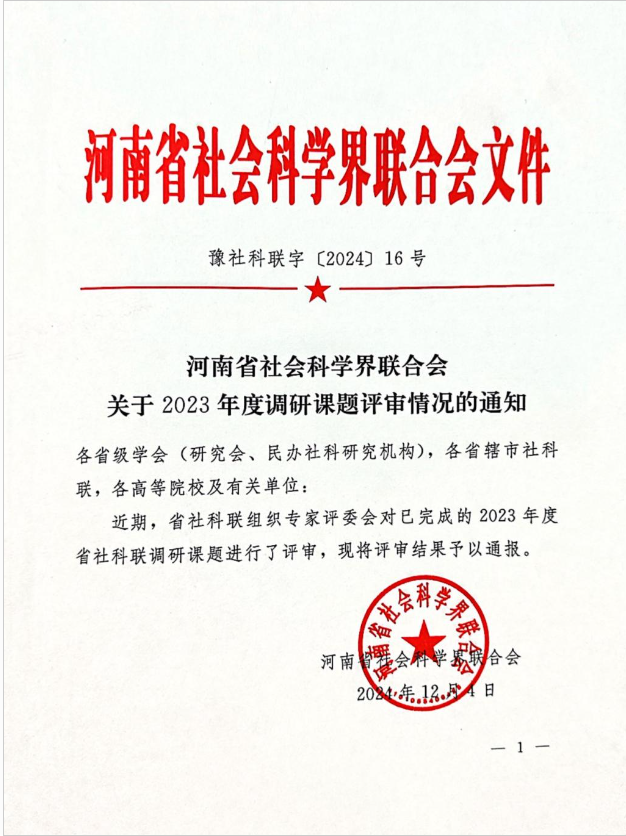近日,河南省社会科学界联合会公布了2023年度调研课题结项、获奖情况,根据《河南省社会科学界联合会关于2023年度调研课题评审情况的通知》(豫社科联字〔2024〕16号),yl23411教师在2023年度该类课题顺利结项5项。