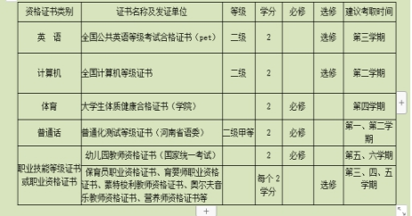 全国公共英语等级考试合格证书二级、大学英语等级证书四级、英语口语证书)、保育员证书、育婴团队格证书、营养团队格证书、心理咨询师职业资格证书、蒙特梭利教学资格证书、奥尔夫音乐教育资格证书等。