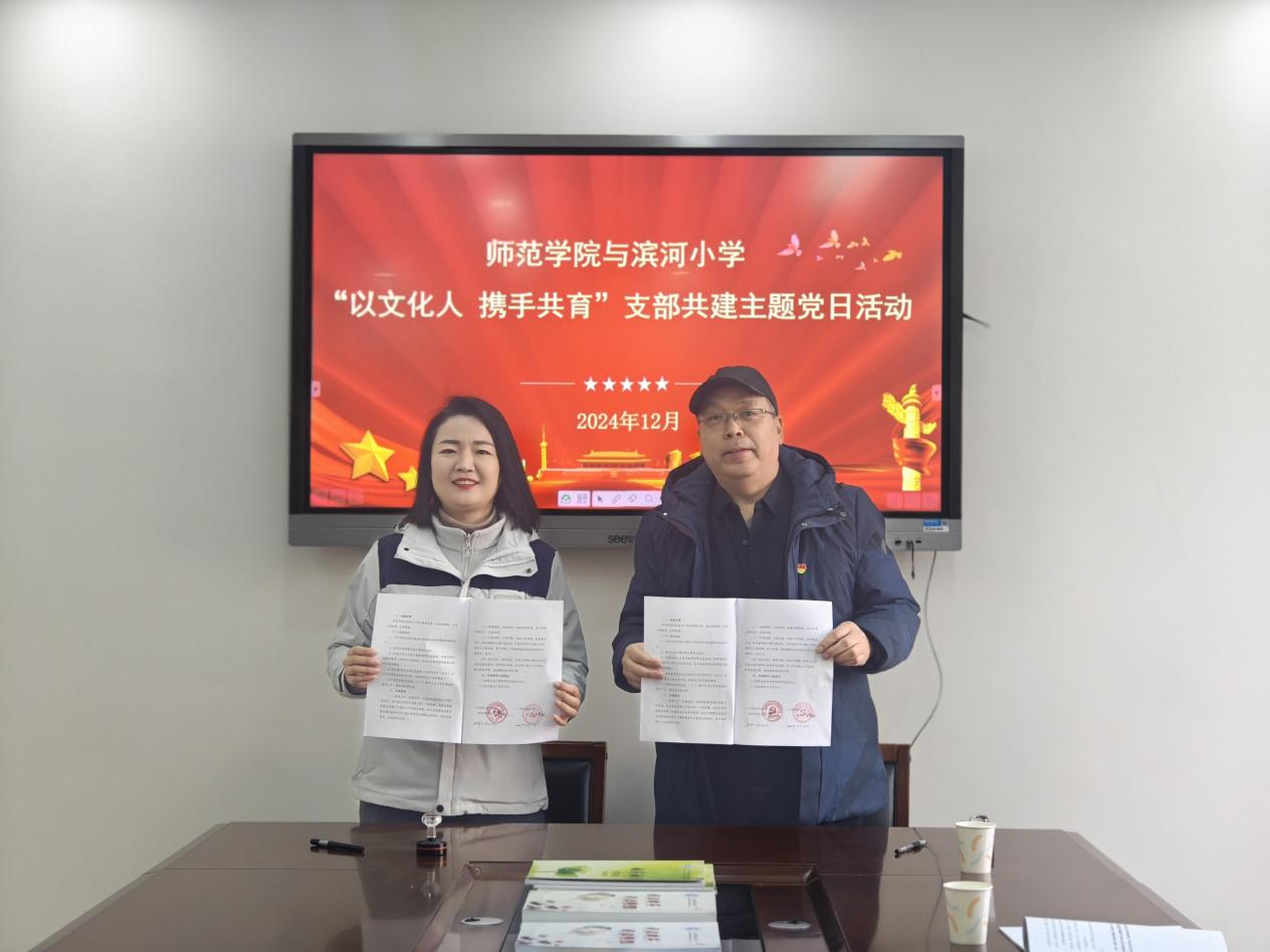 yl23411小学语文教育专业党支部书记高娓娓宣读结对共建协议书,yl23411公司党总支书记樊卫兵与三门峡市滨河小学党支部副书记苏梦醒签订结对共建协议。未来两所公司党支部将建立起幼教人才合作共育平台,在各方面开展深度合作,推进党建、业务融合促进。