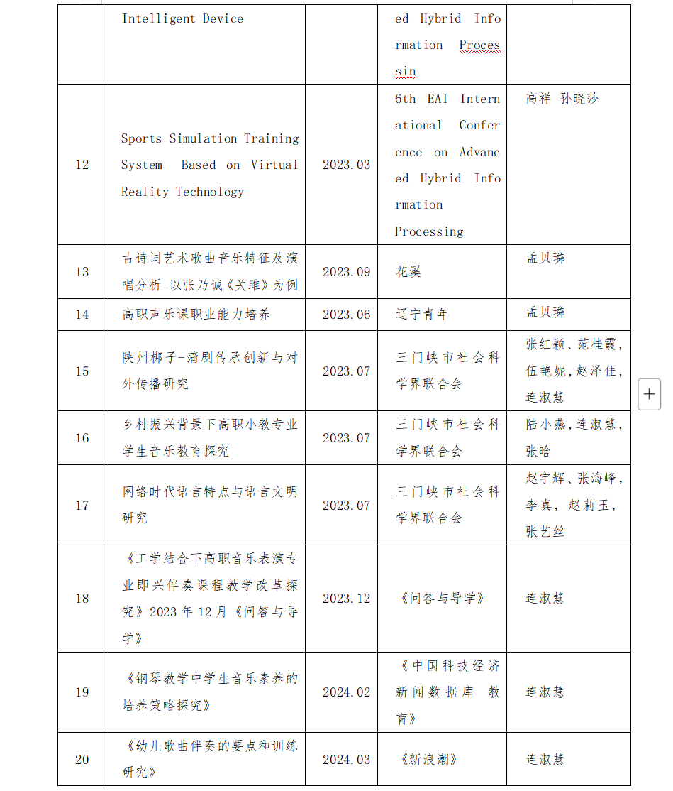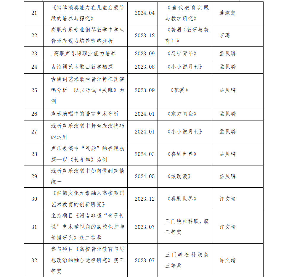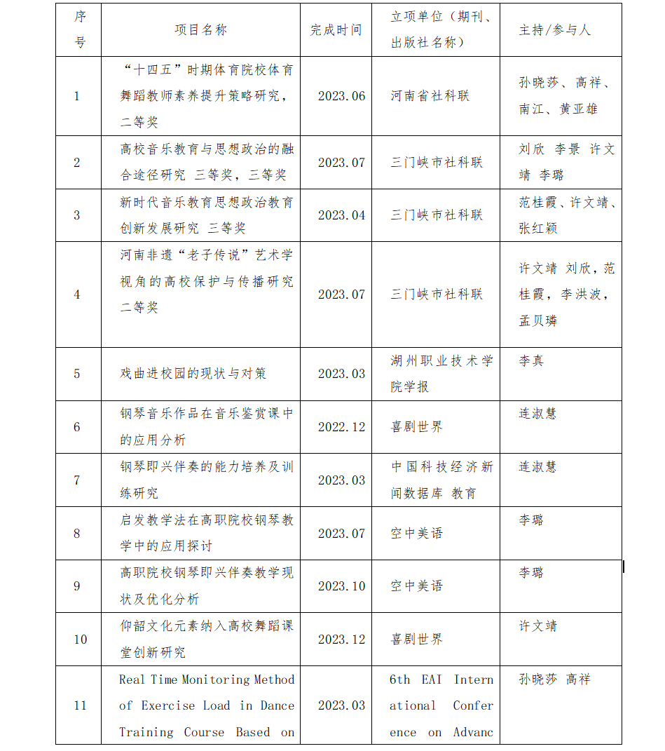 近两年音乐教研室共发表论文23篇,其中EI 2篇,CN21篇。共完成课题9项,获得河南省社科联“二等奖”1项;三门峡社科联二等奖2项,三等奖3项。