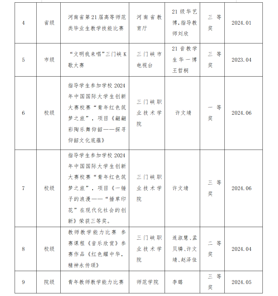 音乐教研室近两年教学中共获得省级奖项四个,分别为一等奖1个、二等奖1个、三等奖2个,市级和校级奖项共五个,分别为一等奖1个,二等奖1个,三等奖3个。
