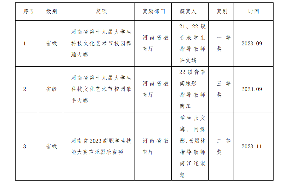 2002年音乐专科招生以来,目前已为社会培养了大批优秀毕业生,用人单位对毕业生满意率达96%以上,员工就业率达97%。特别是专升本升学率在全省同类院校中始终名列前茅。近几年,本专业参加省级以上技能比赛、演出获奖15项以上;参加各级各类大型文艺演出100余场以上。如:2007年1月在推广普通话全国民族唱法专业组中,05级员工杨涛荣获全国金奖,河南省一等奖;2006年7月在全国《拥抱春天》声乐大赛中,04级员工李娜荣获全国铜奖,河南省金奖。师生同台参演中央台“激情广场大家唱”、中央台“同乐五州”节目演出;三门峡历届国际黄河旅游节大型开幕式文艺表演(如2012年5月1000人大合唱活动等);三门峡电视台春节联欢文艺晚会;2013年10月三门峡市七运会开幕式1000人歌舞表演;2014年5月,学院“天鹅之声”合唱团参加全国首届黄河大合唱艺术节获得银奖、同期成功组织了200人合唱团以及200人舞蹈队参加第20届中国(三门峡)国际黄河旅游节大型开幕式群众联欢会等,系列演出与比赛活动受到社会各界与上级领导的广泛好评……