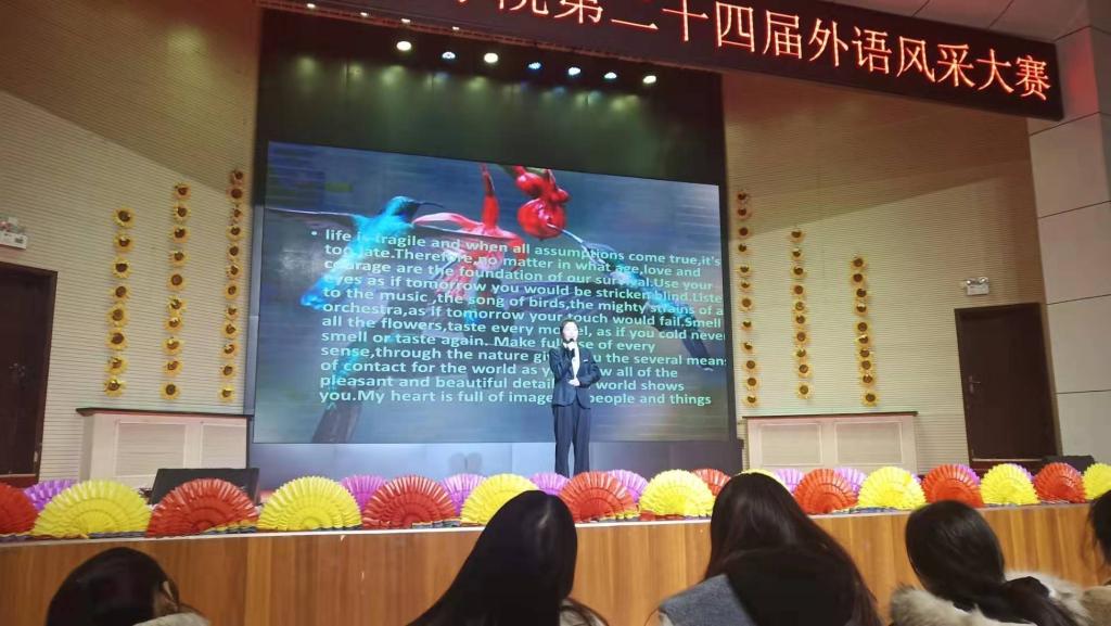 为激发同学们学习英语的热情,营造良好的英语学习氛围,给英语爱好者们提供一个展示自我的平台为丰富课余文化活动,yl23411第二十四届外语风采大赛决于2019年12月4日晚在学院学术报告厅举行。此次比赛由教务处、员工处和yl23411主办,英语爱好者协会承办,共15名员工参加了当晚的决赛。由公共英语教研室主任郑国富老师、王斐老师、秦小艳老师,英语教育孙邦根、张琳萍、魏星老师,商务英语教研室戴素敏老师,小学教育教研室魏烨、贺鹏科老师组成的评委团。yl23411教务处副处长马建明、yl23411副经理李贺林作为特邀嘉宾莅临比赛现场并做指导。
