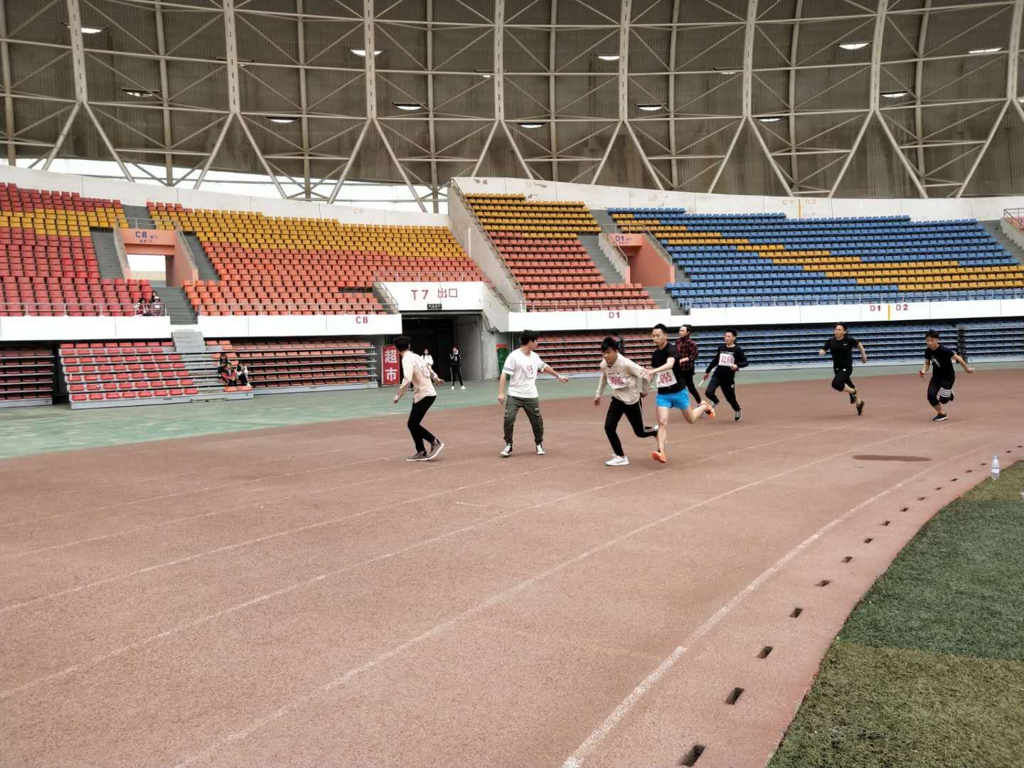 回过头看向操场,百米赛跑已经开始。运动员们在跑道上摩拳擦掌,跃跃欲试。随着一声指令枪响,运动员们如离弦之箭一般向终点奔去。男生斗志昂扬,女生英姿飒爽,如同阳光般闪耀,如同猎豹般奔跑。二人三足既丰富了我们的课余生活,也增强了我们的身体素质和团队合作精神。让我们把目光从运动场上收回,投向那些默默工作的幕后人员。负责运动会播音的是学院学干,主席台上热闹非凡,一张张写满祝福或庆贺的纸片接连不断。播音员们以饱满激昂音调不断宣读。他们不如运动员那样耀眼,但他们同样辛苦非凡,他们尽心尽职,用声音鼓舞着场上每一位运动健儿!