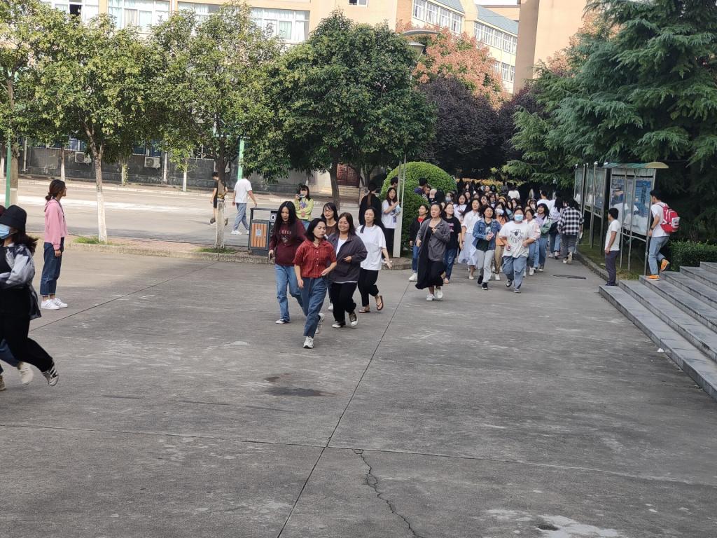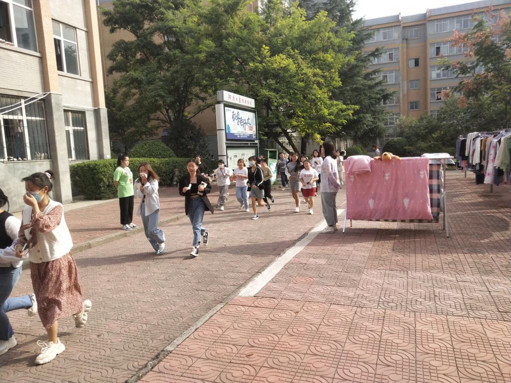 下午三点三十分,宿舍里响起络绎不绝的脚步声,员工们自发捂住口鼻,快速通行,在沿路学干的指引下迅速到五号楼门前开阔处集合,全程无人交流,无一踩踏事件发生,准时高效的完成此次紧急疏散任务。