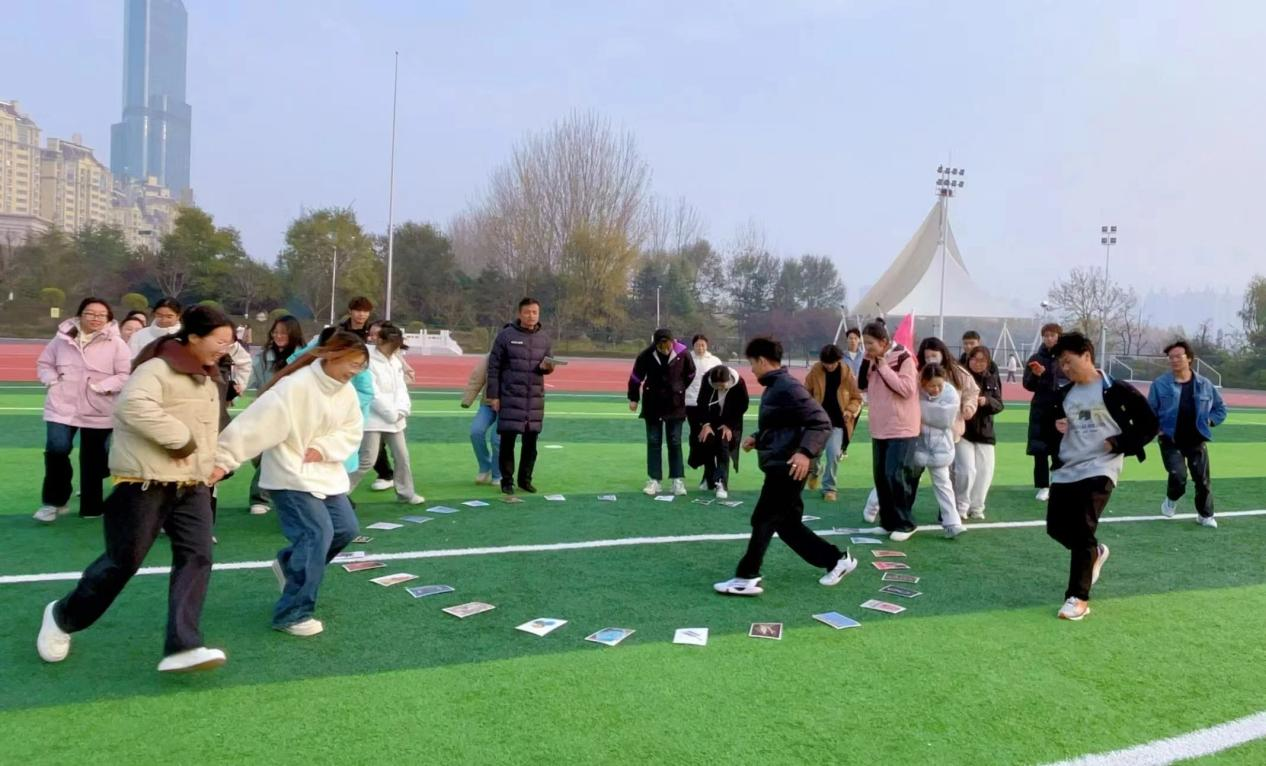 首先进行的是热身运动教练说和大风吹,大家围成一个大圈,手把着手脚抵着脚,随着号令进行简单的团体性的肢体活动,让同学们更加放松身心,为接下来的挑战做好准备。热身不仅让大家迅速进入状态,还激发了大家的参与热情,为整个活动奠定了良好基础。紧接着,活动进入了分组选队长的环节。学干们被随机分成若干小组,每个小组需要迅速选出一位队长、队秘及“宠物”,并确定团队的口号和动作标志。这一环节不仅让大家快速熟悉了彼此,还增强了团队的凝聚力和归属感。各小组在队长的带领下,纷纷亮出了自己的团队口号和标志,现场气氛热烈而欢快。
