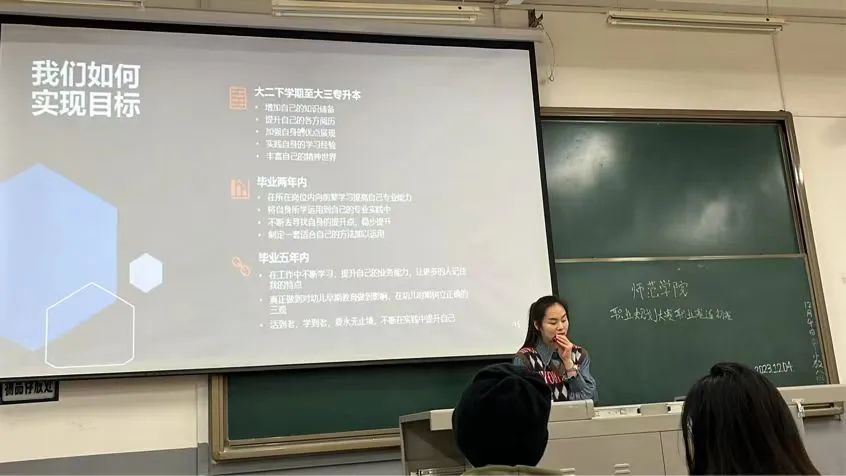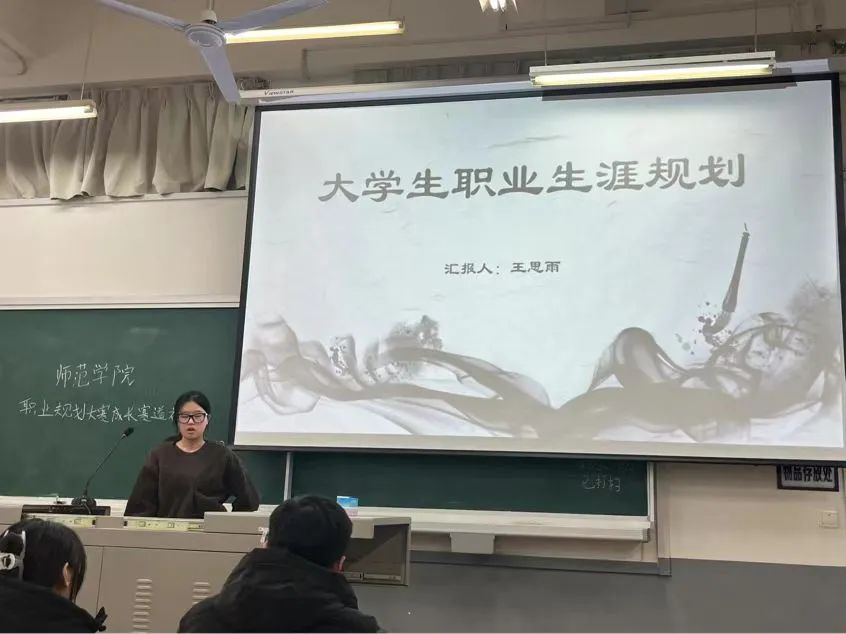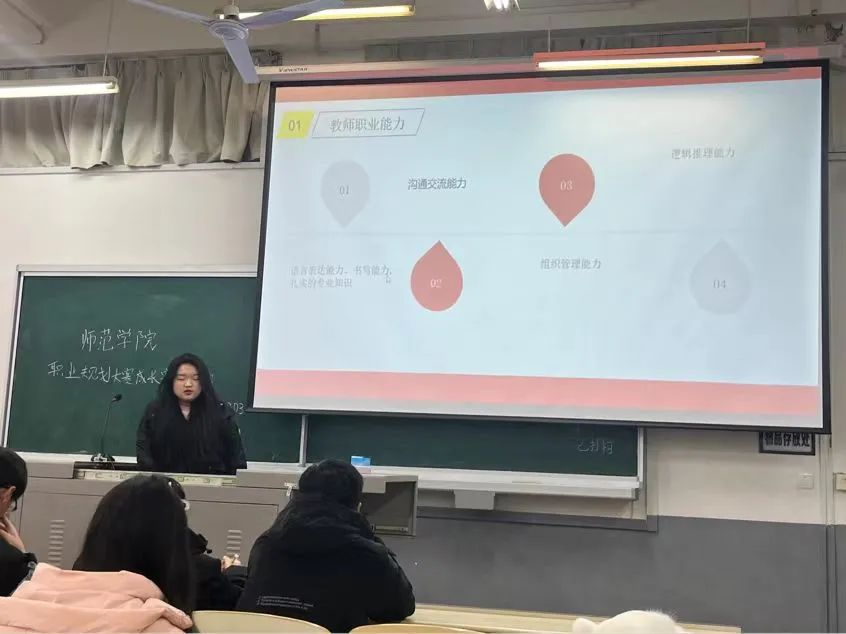 22级小学教育12班王思雨同学刚打开ppt,我们就很容易看出她向往的职业,没错,她所选择的职业是特级小学书法教师,她也多方面考虑,为自己以后的职业做了充足的打算。