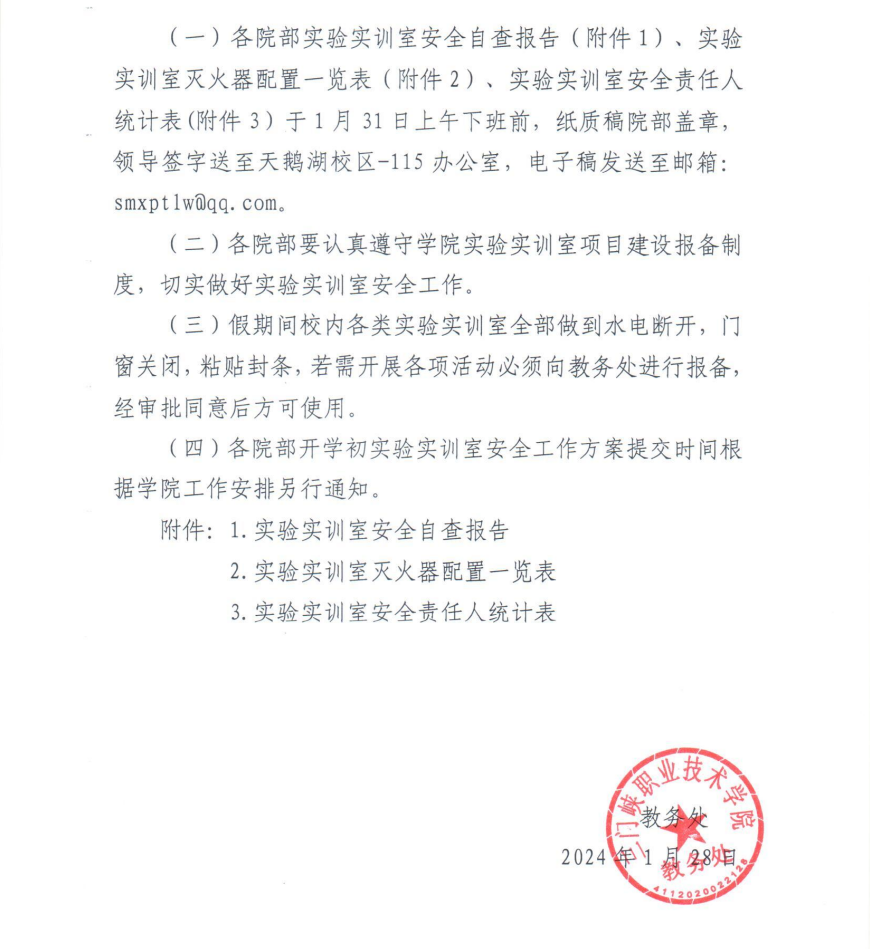 关于加强2024年寒假期间及开学前实验实训室安全工作的通知