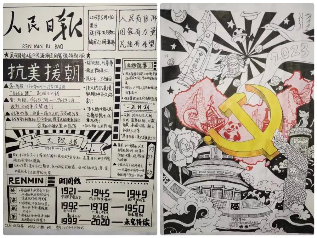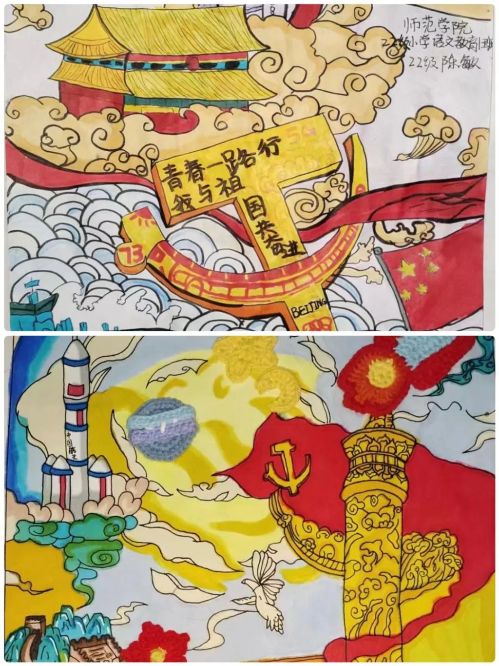 其次,同学们以笔为船,以线为舵,化梦为帆,通过绘画、手抄报等形式,在点、线、面的节奏中,在七彩流光的韵律中,表达了对党和国家的热爱以及对美好生活的向往。其中《共筑中国梦》、《不忘初心跟党走》等精美的绘画作品带领我们重温革命历史,传承红色基因,描绘出了心中对党、对祖国浓浓的敬仰之情。这些作品主题鲜明,弘扬了民族传统文化和正能量,展现了青年们爱党爱国、奋发进取、积极向上、朝气蓬勃的精神风貌。