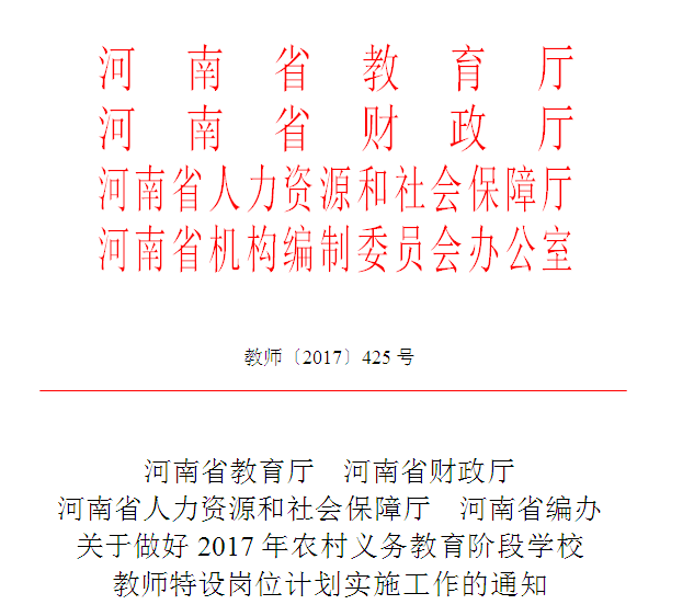 为贯彻落实《乡村教师支持计划(2015-2020年)》,鼓励引导高校毕业生到基层就业,吸引更多优秀人才到农村学校从教,提高农村义务教育质量,根据《教育部办公厅 财政部办公厅关于做好2017年农村义务教育阶段学校教师特设岗位计划实施工作的通知》(教师厅〔2017〕4号)精神,现就做好2017年农村义务教育阶段学校教师特设岗位计划(以下简称特岗计划)实施工作通知如下: