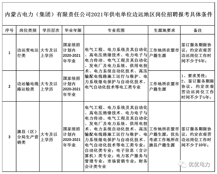 注:1、乌海电业局、锡林郭勒电业局、阿拉善电业局、乌海超高压供电局毕业年限放宽至2019年;2、乌海电业局、阿拉善电业局生源地要求为本地和相邻地区生源;3、内蒙古超高压供电局生源地要求为包头市和乌兰察布市生源;4、乌海超高压供电局生源地要求为巴彦淖尔市、阿拉善盟和其相邻生源