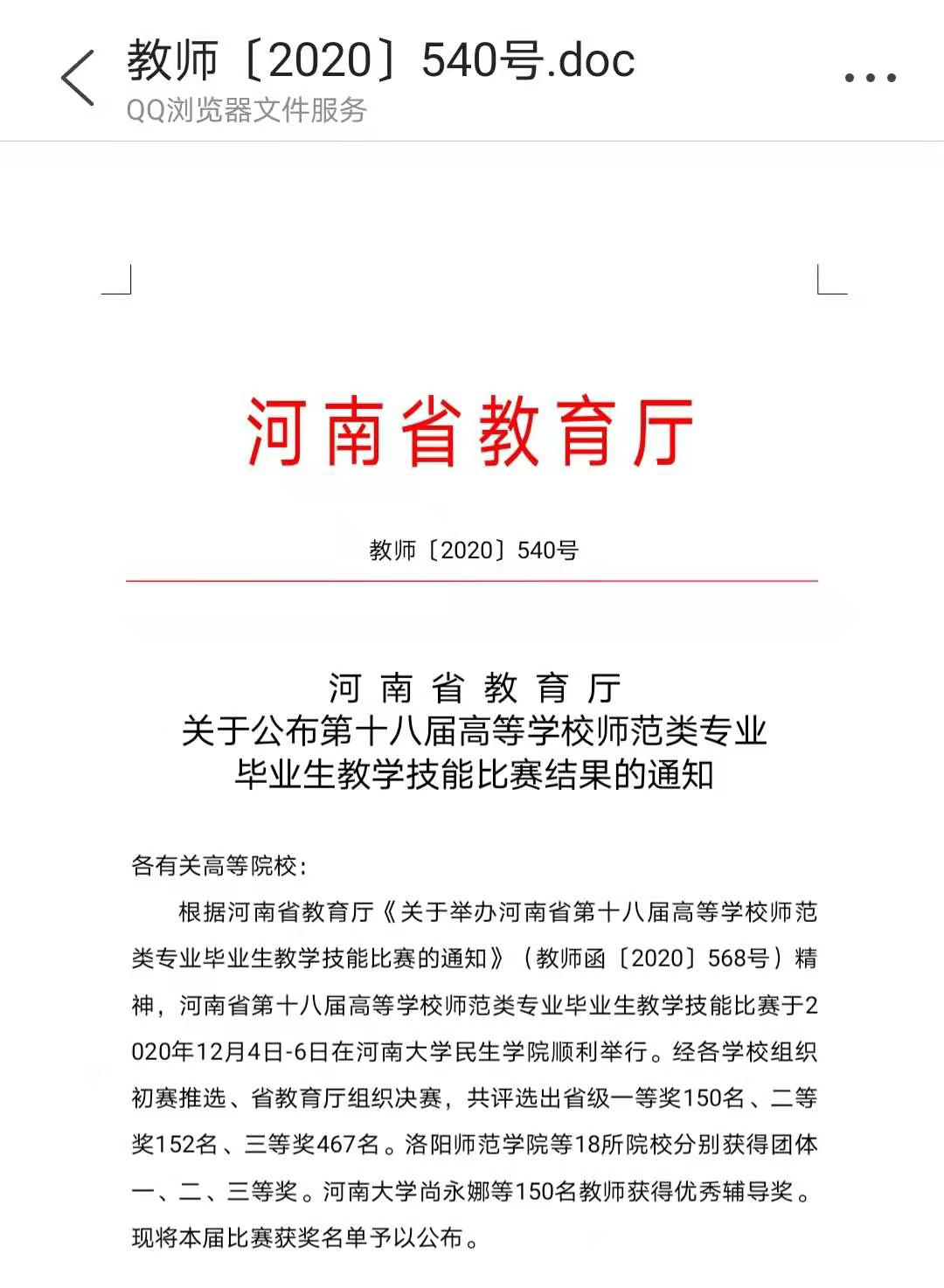 为提高小学教育专业毕业生教学技能, 2020年12月4日, 小学教育专业2018级毕业生尹嫚在小学教育专业教师的带领下参加了河南省第十八届高等学校师范类专业毕业生教学技能大赛。