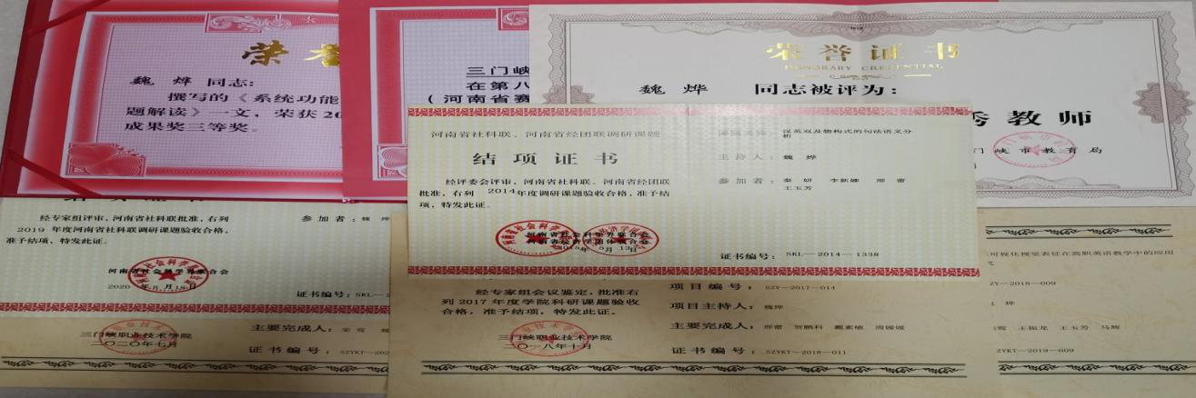 魏烨:上海海事大学文学硕士,副教授。yl23411小学教育教研室主任。发表论文20多篇,主持并参与省级、市级、校级各类课题11项;参编教材及专著3部,独立翻译旅游影集一部并出版,发表学术论文20余篇,发表SCI/SSCI双检索论文1篇。2002年获河南省教育厅高教处举办竞赛一等奖,2006年至2008年期间,参与上海花木街道安全社区建设中,为世界卫生组织官员做口笔译,2017年获省教育厅技能竞赛三等奖,同年还在外研社“教学之星”大赛复赛上获得一等奖,并多次为三门峡领导做口笔译。主要研究方向:英汉对比,英语教学。