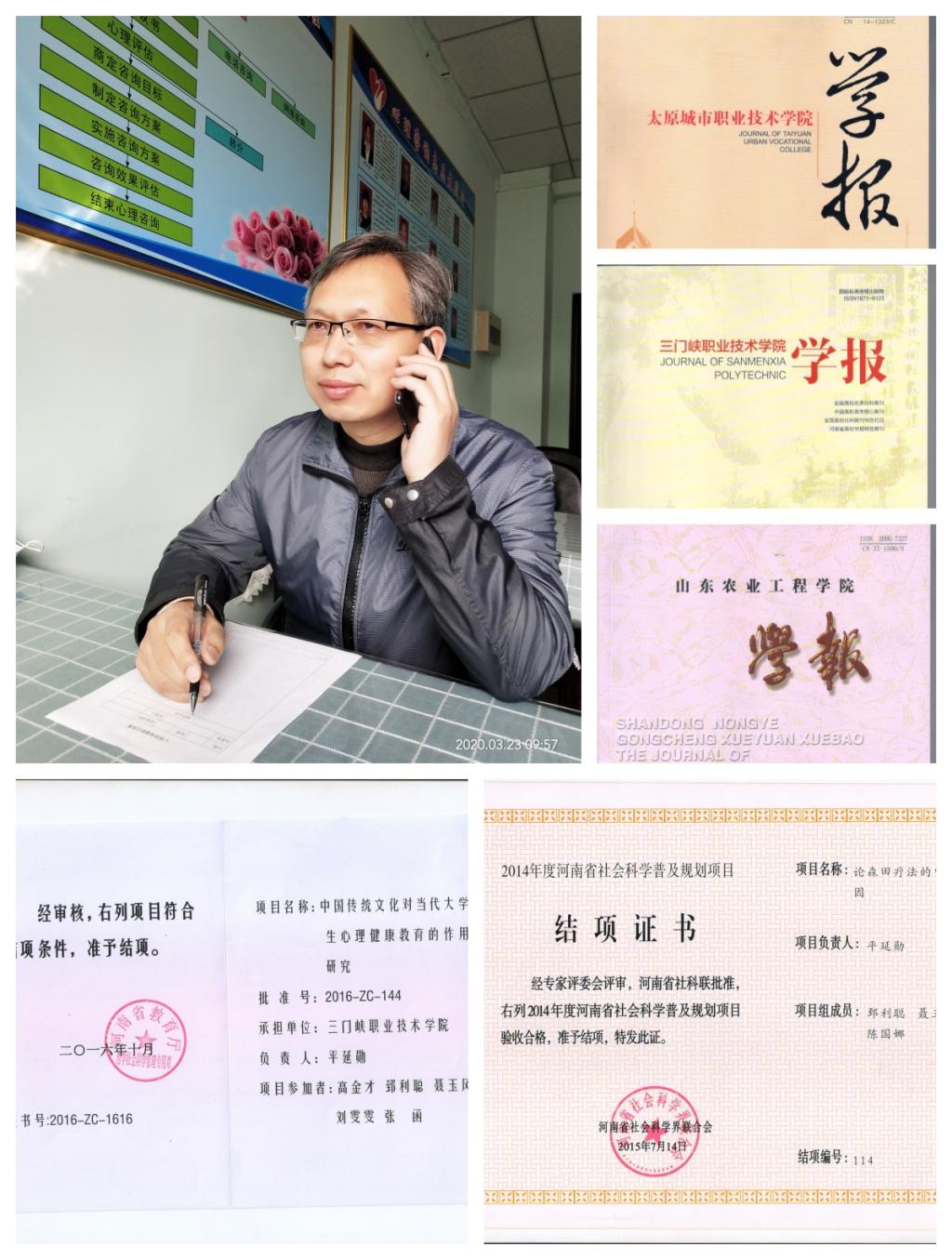 平延勋,男,1996年6月毕业于河南大学心理教育专业,国家二级心理咨询师,2005年被三门峡武警支队聘为心理健康咨询辅导员。2006年5月,参加河南省高校心理咨询人员培训班,2016年5月,参加杨凤池《分析体验式心理咨询技术》培训,2017年11月参加中美心理研讨会。一直从事心理学和老员工心理健康的教学与研究。多次荣获教学质量优秀奖、优秀教师、优秀班主任、优秀党务工作者、优秀共产党员、职业道德标兵等荣誉。